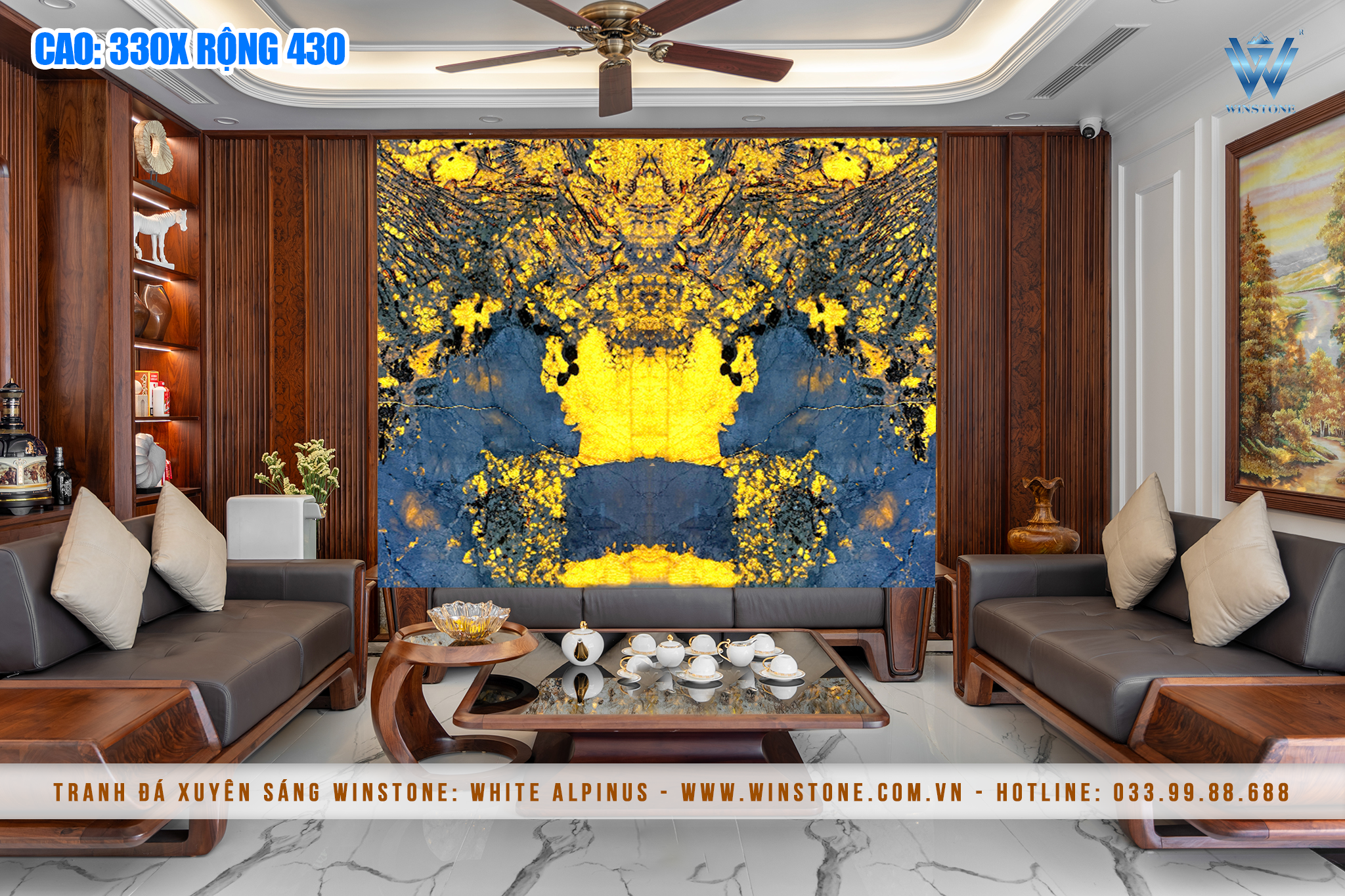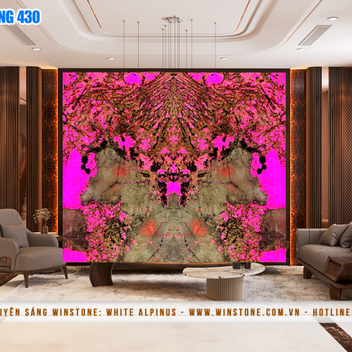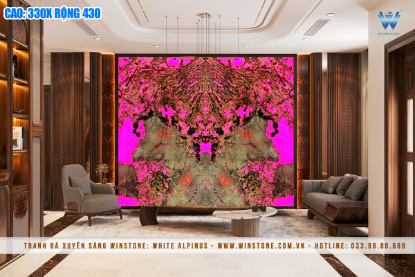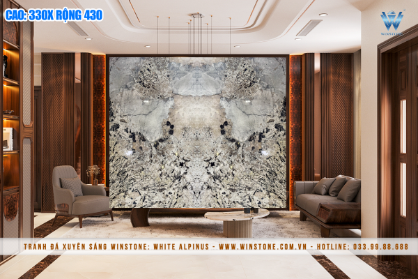 Khi không có ánh sáng, Tranh đá xuyên sáng khoác lên mình sự sang trọng với gam màu tự nhiên cùng các đường vân sống động. Khi kết hợp với hệ thống đèn LED vàng hoặc tím (tùy chọn theo nhu cầu), đá thạch anh Alpinus tạo hiệu ứng ánh sáng huyền ảo, giúp không gian trở nên lung linh và đẳng cấp hơn.